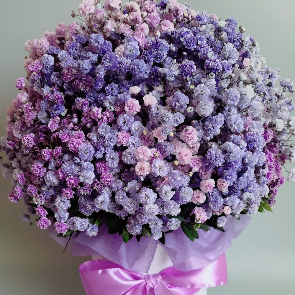 “Сиреневый туман” – композиция из гипсофилы в шляпной коробке