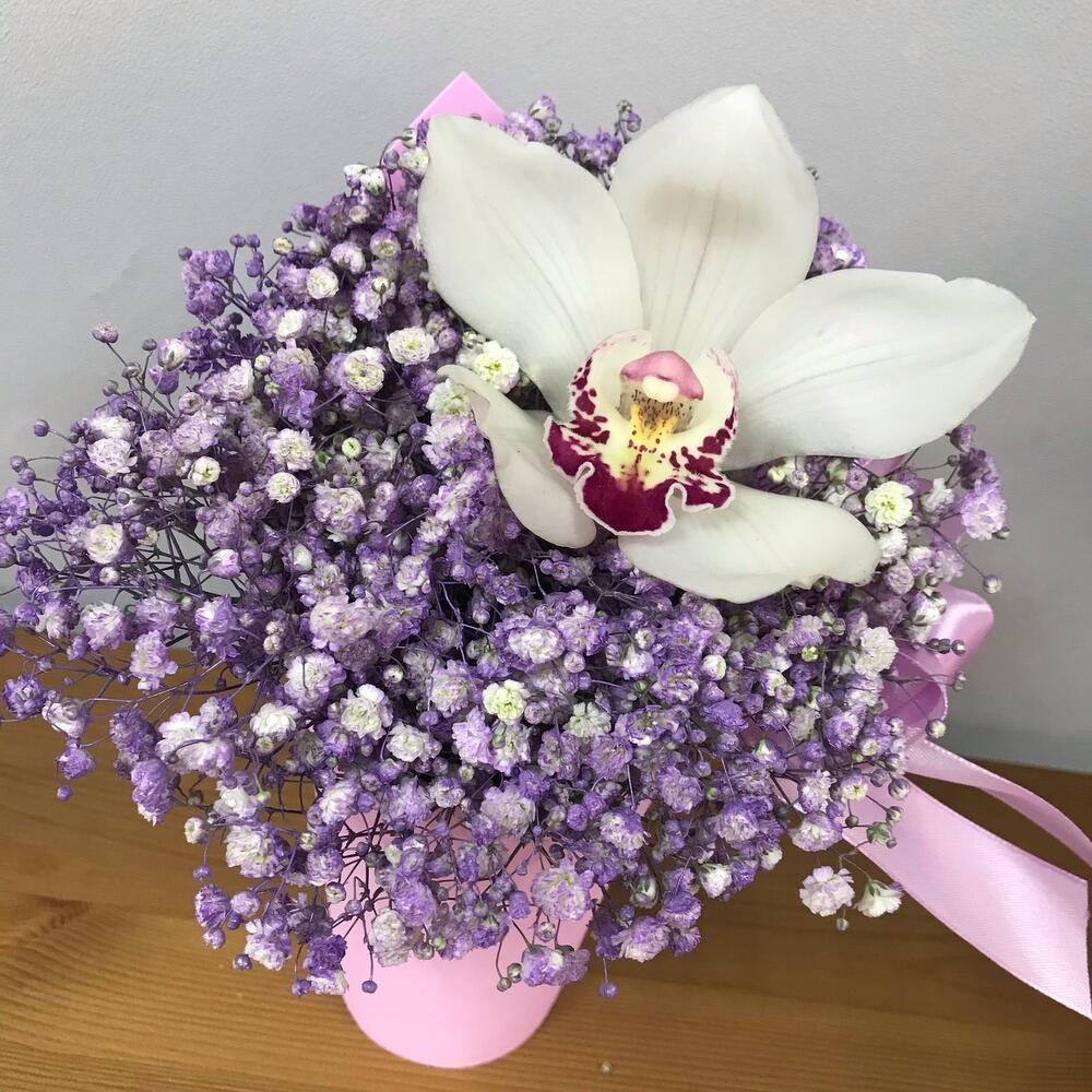 Гипсофила – 4 шт.Орхидея Цимбидиум – 1 шт.Оазис флористический – 1 шт.Стакан – 1 шт.оформление флоамиран – 1 шт.