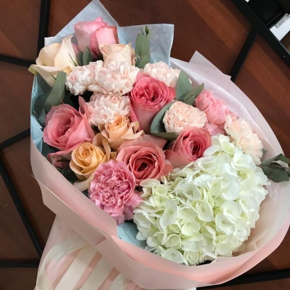 Гвоздики, Пионовидные розы, Розы