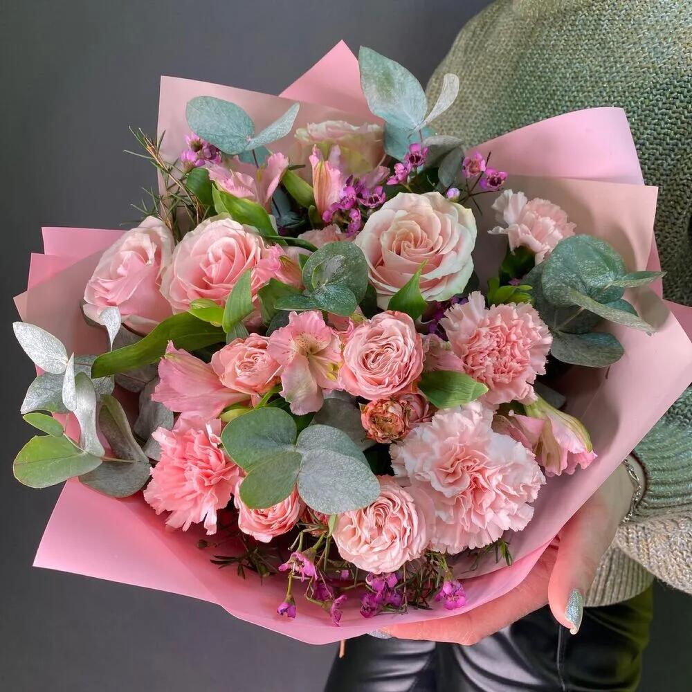 Альстромерии, Гвоздики, Кустовые розы, Лизиантусы, Розы, Хризантемы