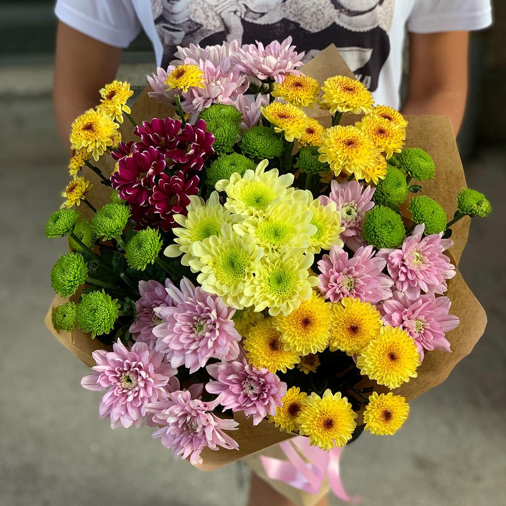 Яркий букетик из разноцветных хризантем в стильном оформлении бумаге крафт.
