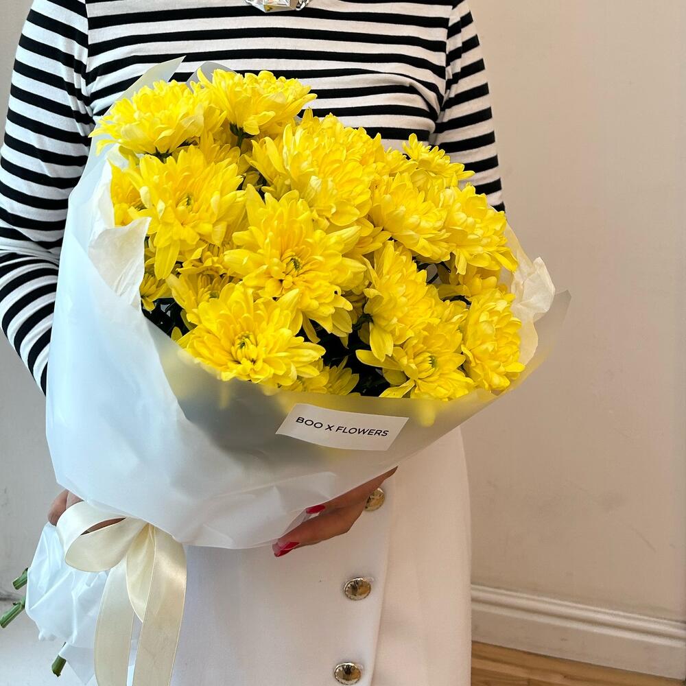 Хризантема кустовая – 5 шт.Лента атласная – 1 шт.Дизайнерская упаковка – 1 шт.
