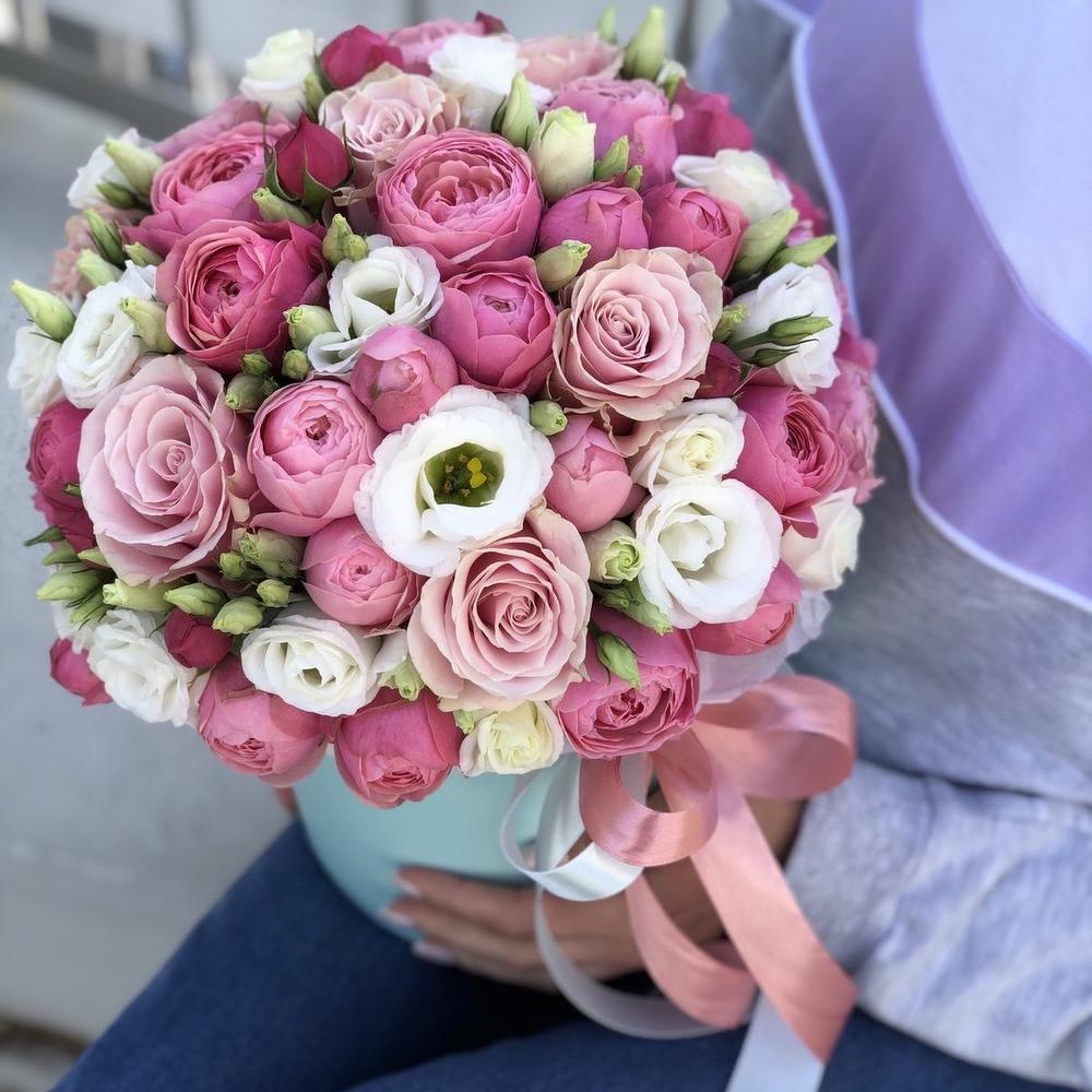 Композиция из пионовидной кустовой розы, эустомы и одноголовой розовой розы