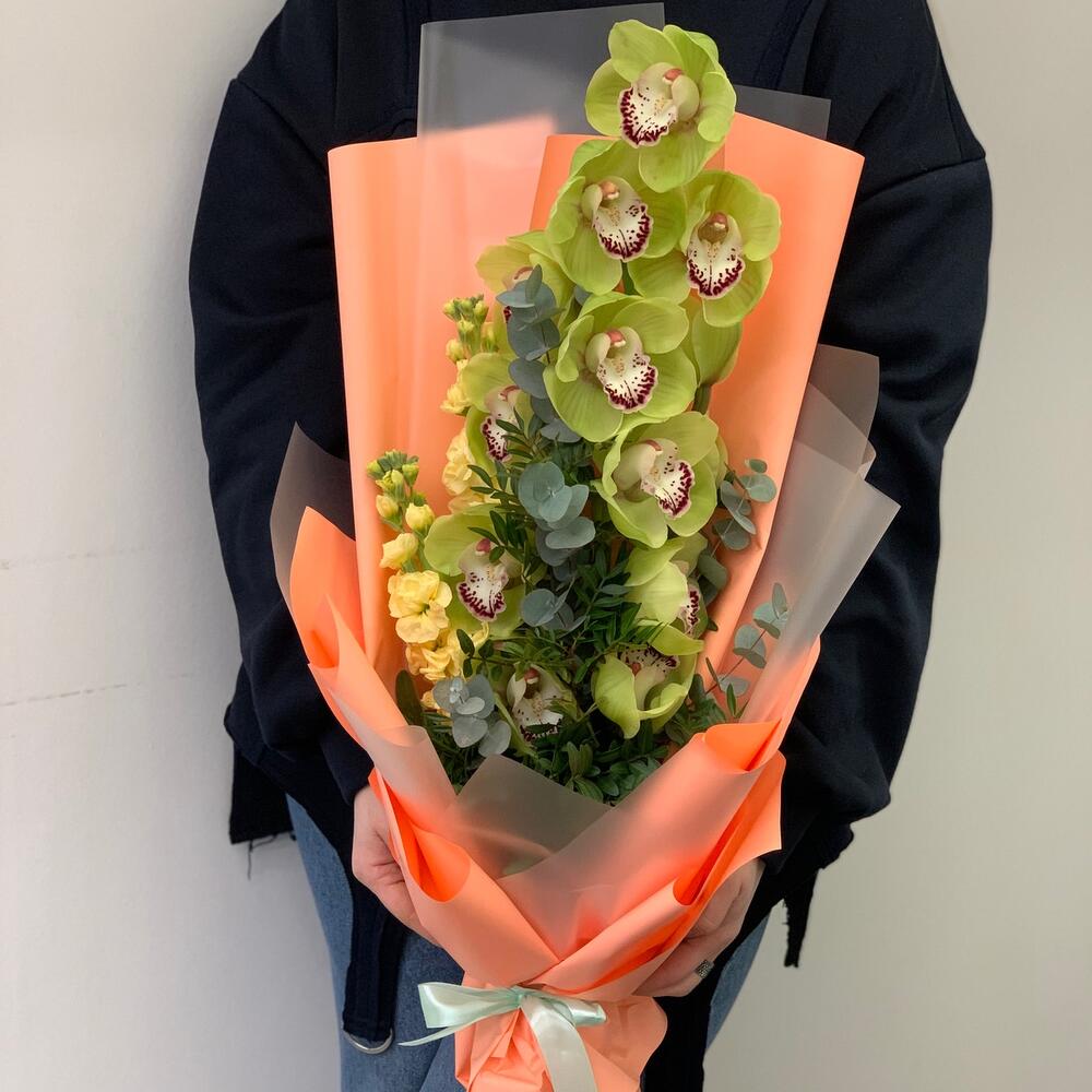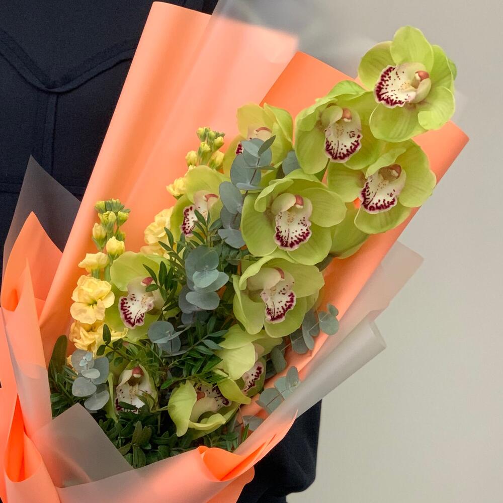 орхидея – 1 шт.Эвкалипт – 1 шт.левкое – 2 шт.Зелень – 2 шт.Дизайнерская упаковка – 3 шт.