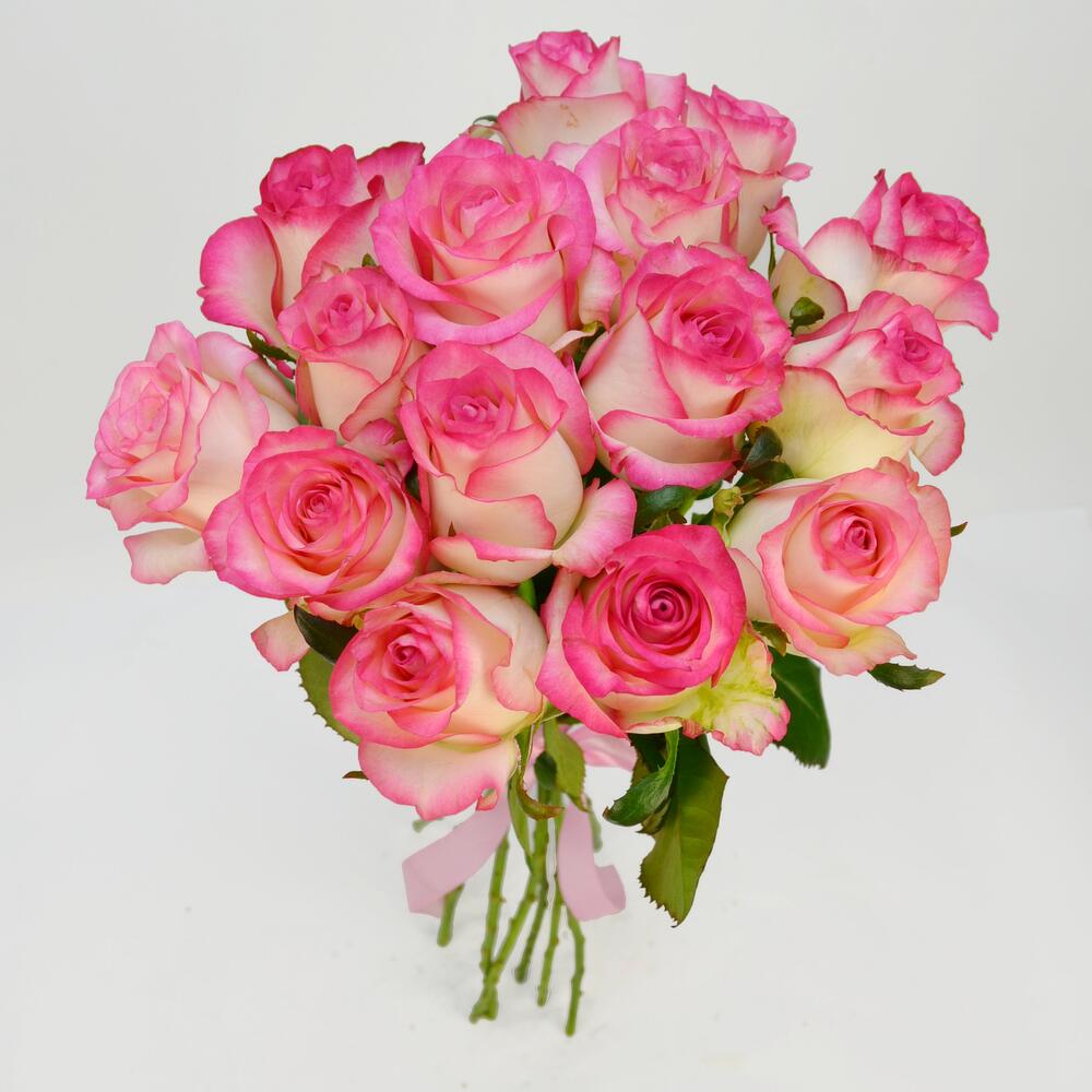 Круглый букет из 15 бело-розовых роз перевязанных атласной лентой. Нежный букет, которому будет рада как молодая девушка, так и женщина в любом возрасте 🙂