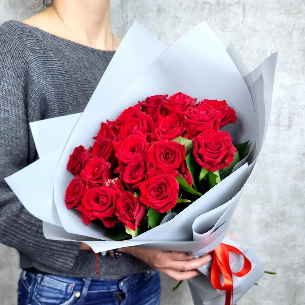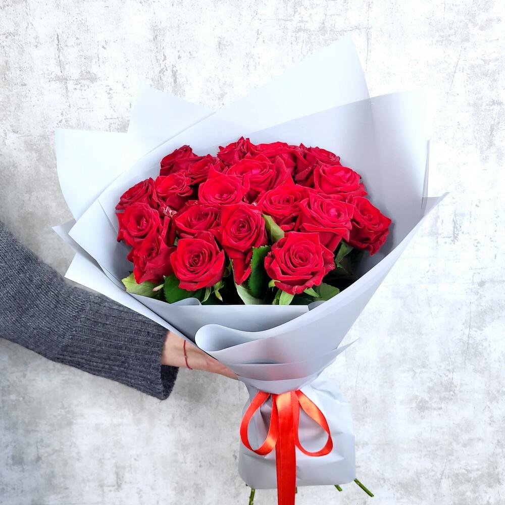 Роза – 19 шт.Лента атласная – 1 шт.Пленка матовая – 1 шт.