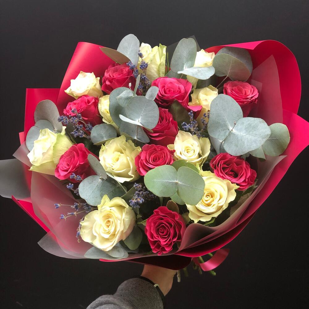 19 роз с эвкалиптом и лавандой