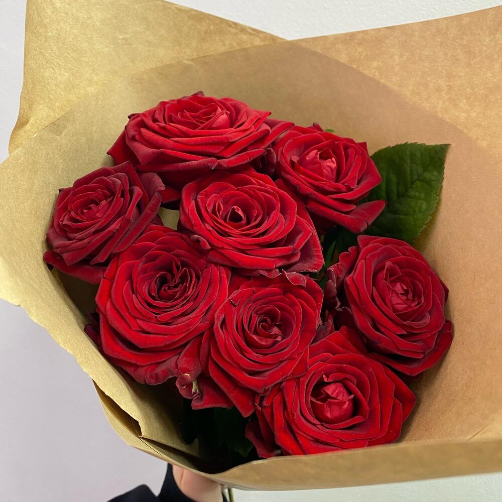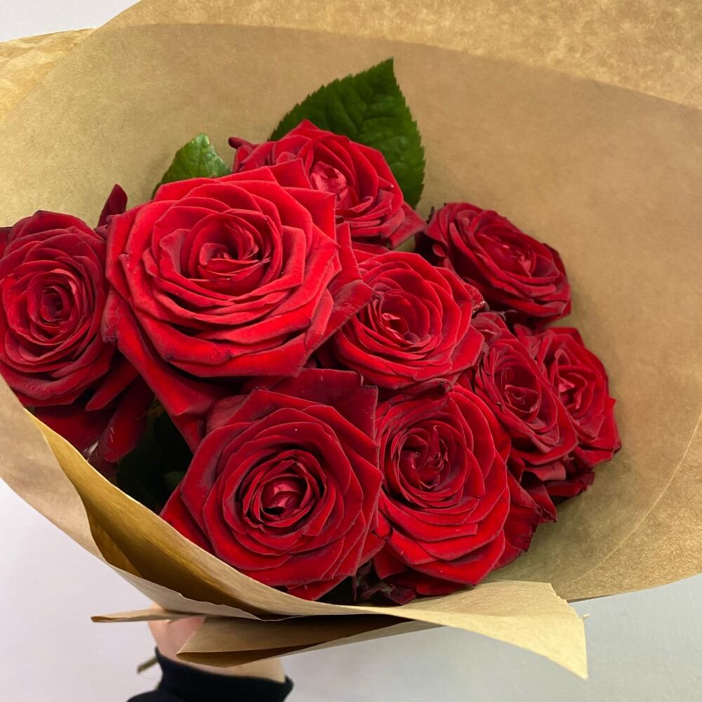 Роза красная – 9 шт.Крафт упаковка – 1 шт.Открыточка с вашими пожеланиями – 1 шт.