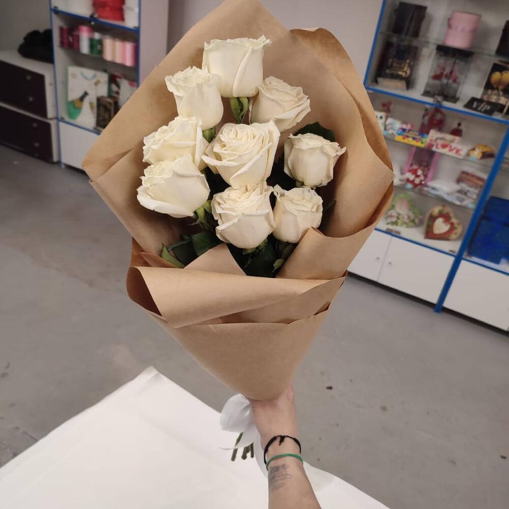 розы 9 штук – 9 шт.Крафт упаковка – 2 шт.Лента атлас – 1 шт.