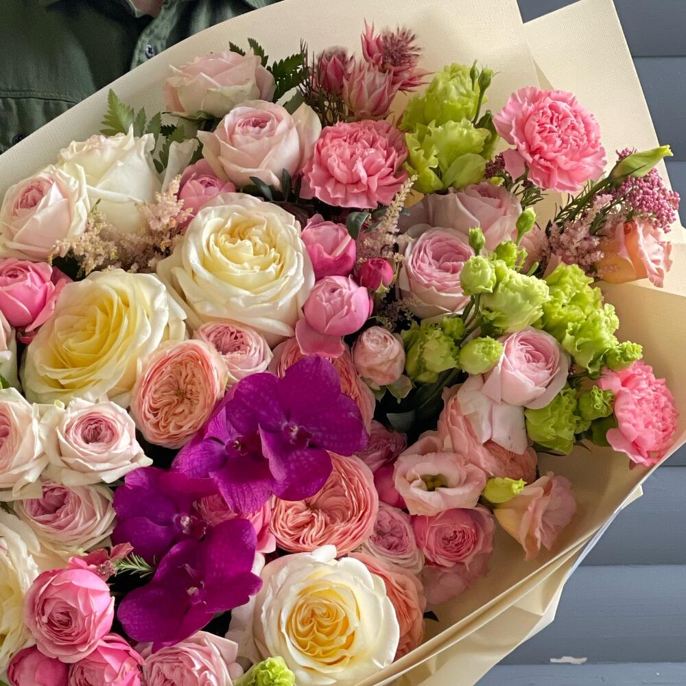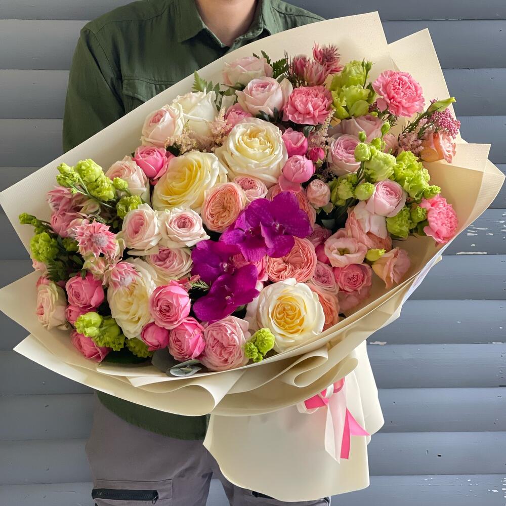 Альстромерии, Кустовые розы, Лизиантусы, Пионовидные розы, Розы, Ромашки