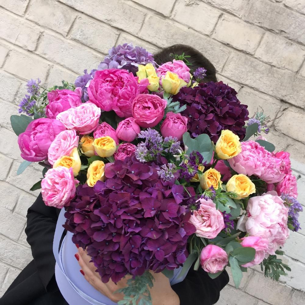 Гортензия – 3 шт.Пион – 5 шт.Роза кустовая пионовидная – 7 шт.Статица – 3 шт.Эвкалипт – 5 шт.Оазис флористический – 1 шт.Тишью – 2 шт.Коробка шляпная – 1 шт.