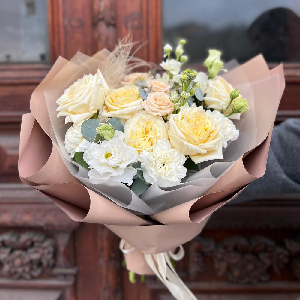 роза кэндллайт – 5 шт.Маттиола – 2 шт.Ковыль – 1 шт.Диантус – 3 шт.эустома махровая белая – 1 шт.роза кустовая таня – 1 шт.Эвкалипт – 1 шт.Пленка матовая – 7 шт.Лента атласная – 2 шт.