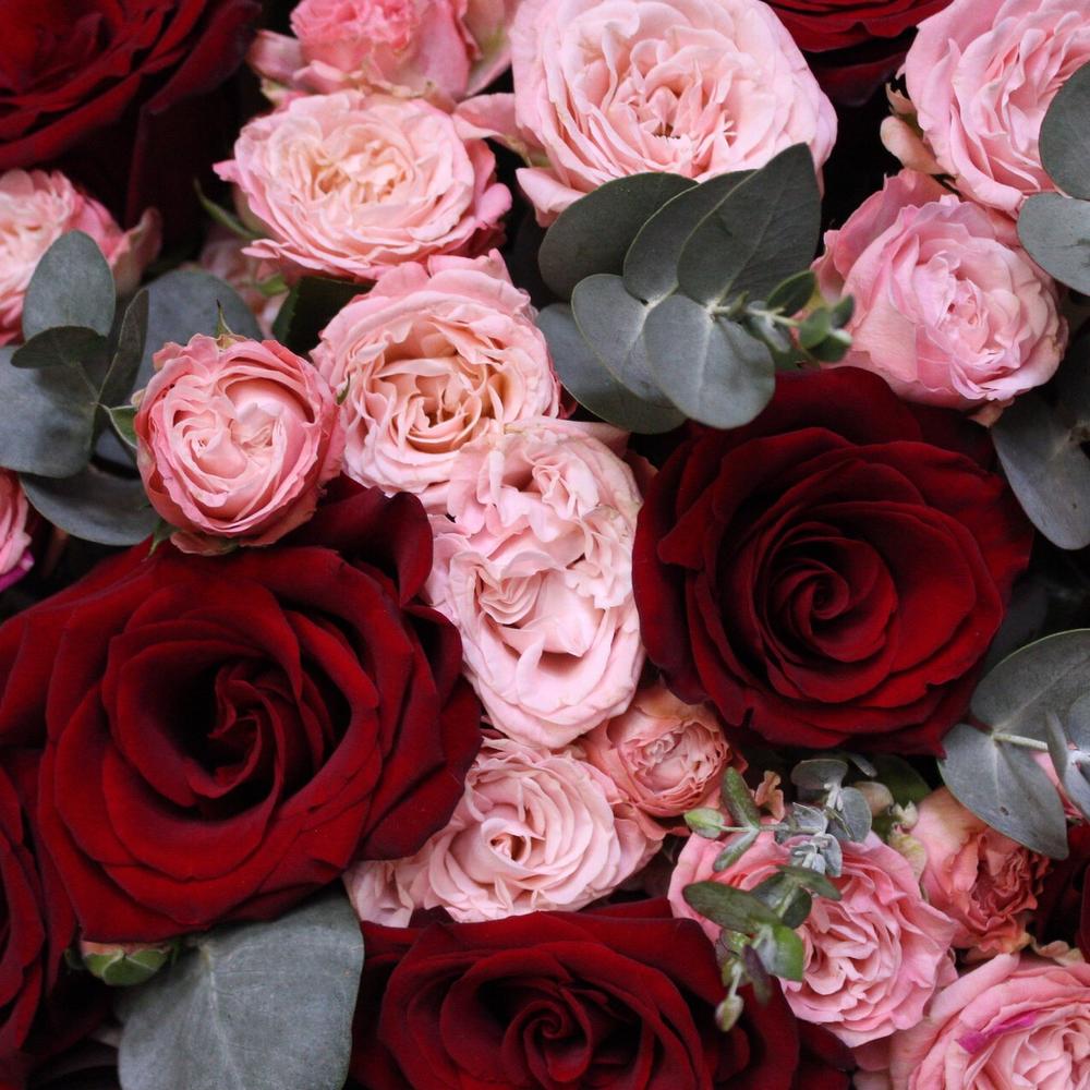 Роза Эксплорер – 9 шт.Роза кустовая пионовидная мадам бомбастик – 6 шт.Эвкалипт – 3 шт.Пленка дизайнерская – 4 шт.Лента атласная – 1 шт.