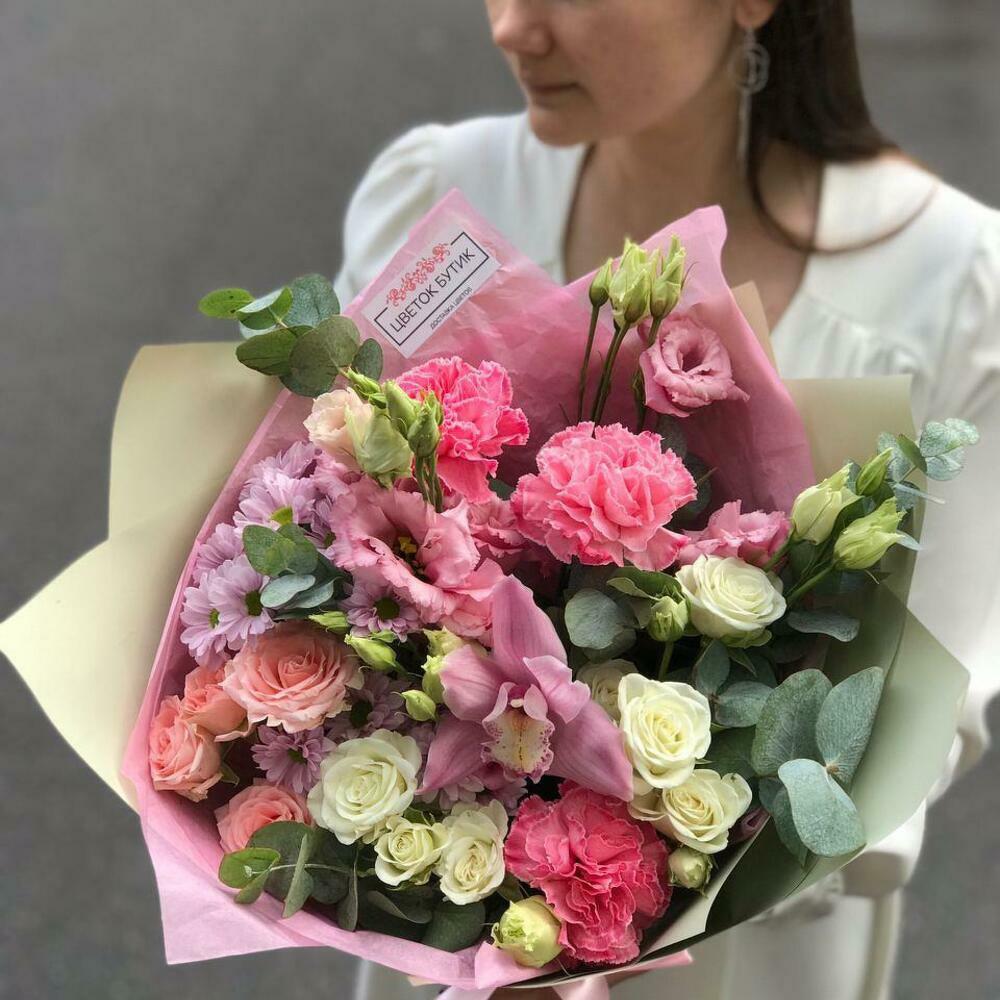 Роза кустовая – 1 шт.Хризантема кустовая – 2 шт.Эустома – 5 шт.Диантус – 3 шт.орхидея – 1 шт.зелень эвкалипта – 4 шт.