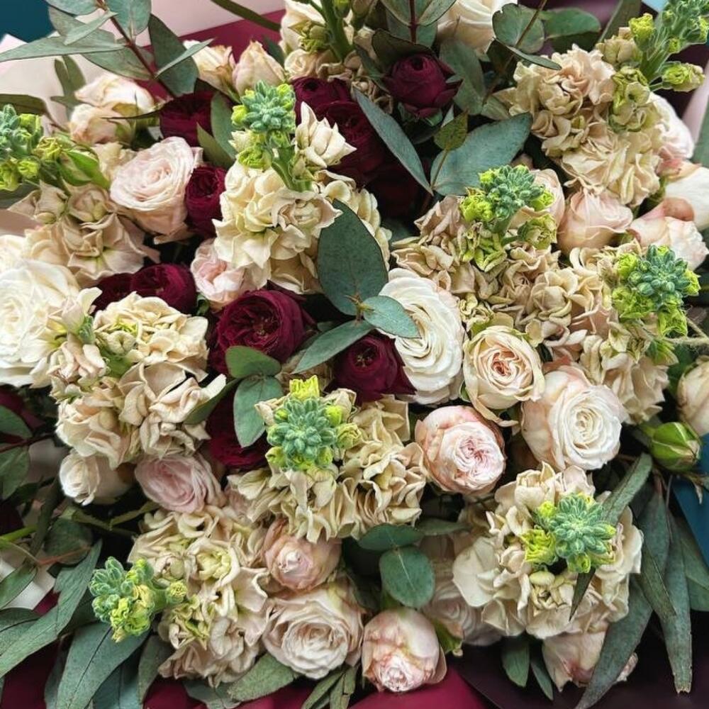 Гвоздики, Кустовые розы, Лизиантусы, Пионовидные розы, Розы