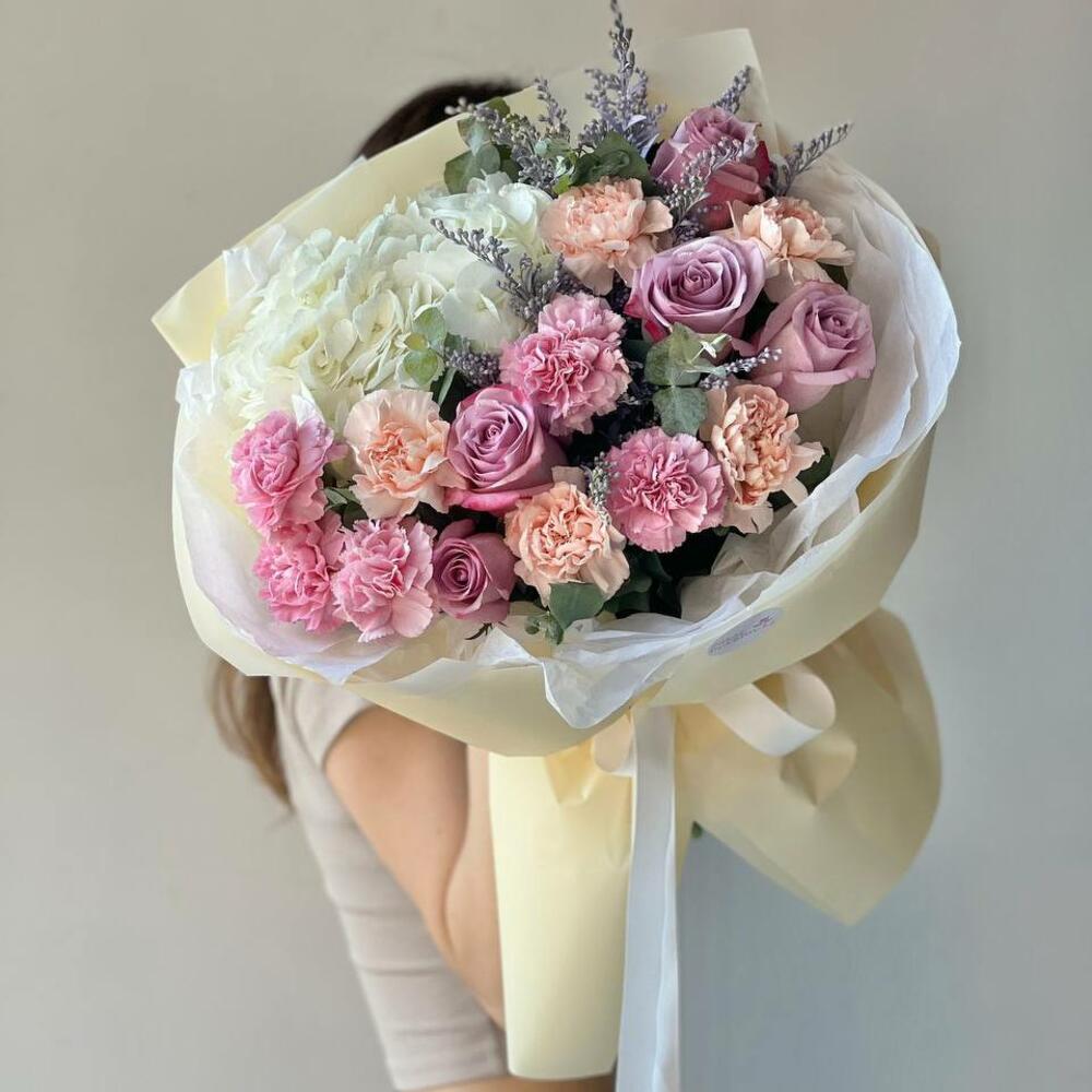 Альстромерии, Гвоздики, Кустовые розы, Лизиантусы, Розы, Хризантемы