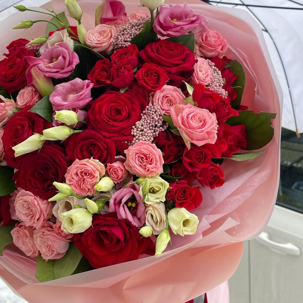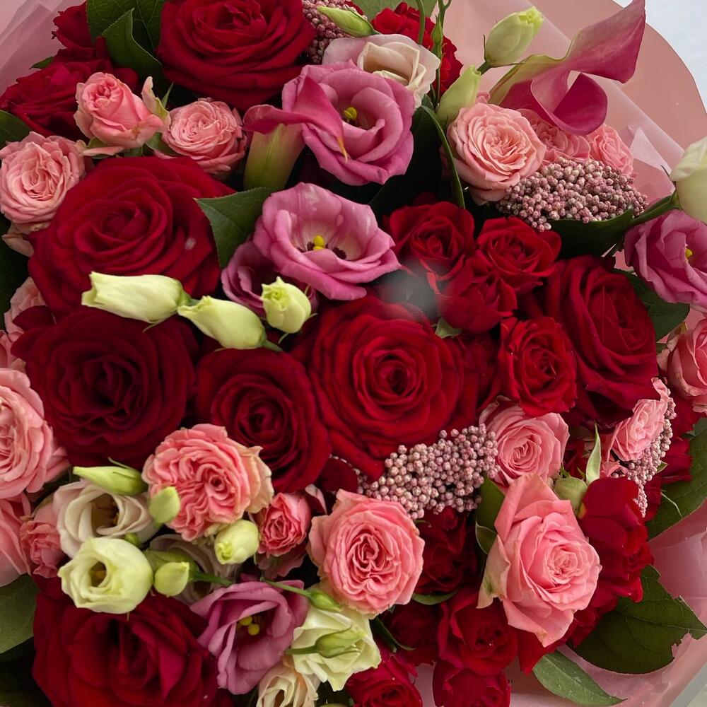Роза красная россия – 9 шт.Кустовая красная роза – 10 шт.босбастик роза – 6 шт.Калла – 2 шт.эустома розовая – 5 шт.Озотамнус розовый – 4 шт.Салал пучок – 1 шт.Тишью – 8 шт.Пленка матовая – 8 шт.Лента атласная – 2 шт.