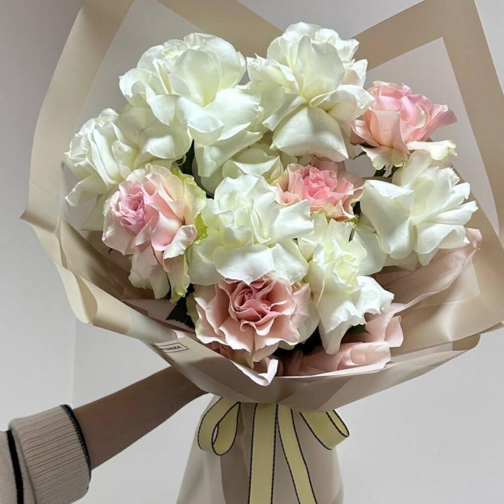 Букет упакован в корейскую пленку и перевязан атласной лентой.