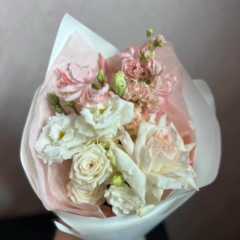 Пионовидная роза – 1 шт.Кустовая пионовидная роза – 1 шт.Маттиола – 1 шт.нерина розовая – 1 шт.Лизиантус – 1 шт.декоративная упаковка – 1 шт.Атласная лента – 1 шт.