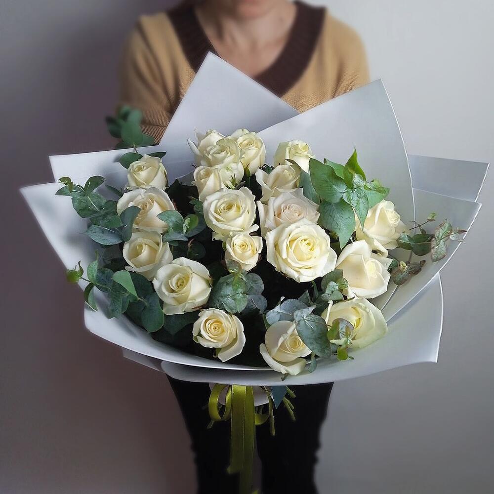 Роза – 21 шт.Эвкалипт – 6 шт.Дизайнерская упаковка – 1 шт.Лента атласная – 1 шт.подкормка для срезанных цветов – 1 шт.