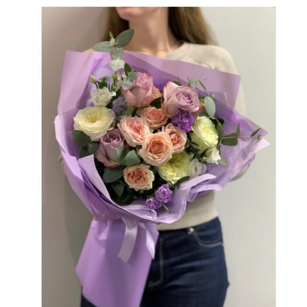 Гвоздики, Лизиантусы, Розы, Тюльпаны