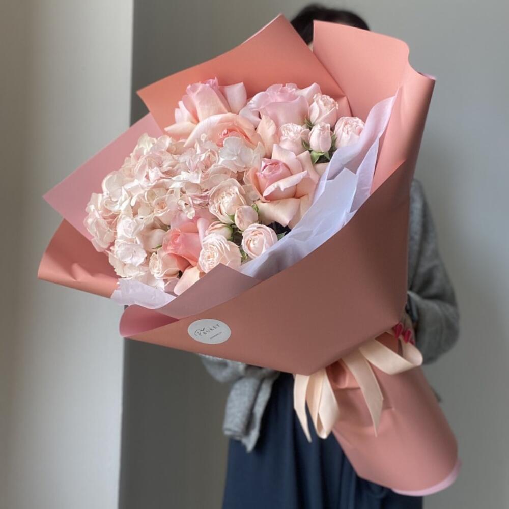 Альстромерии, Гвоздики, Кустовые розы, Лизиантусы, Розы, Хризантемы
