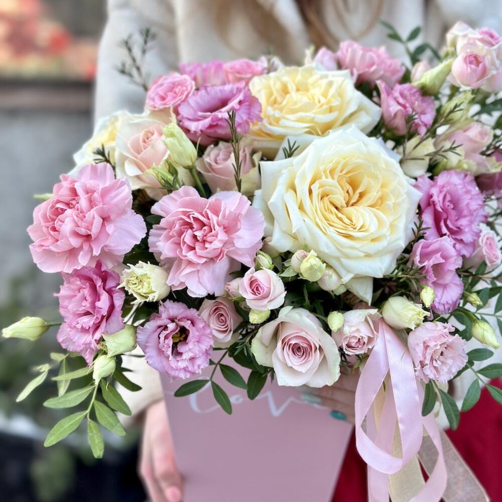 Роза пионовидная – 2 шт.Роза – 5 шт.лизиантус розовый алиса – 4 шт.Роза кустовая – 2 шт.Диантус – 5 шт.декоративная зелень – 5 шт.Коробка – 1 шт.Флористическая губка – 1 шт.Бант – 1 шт.