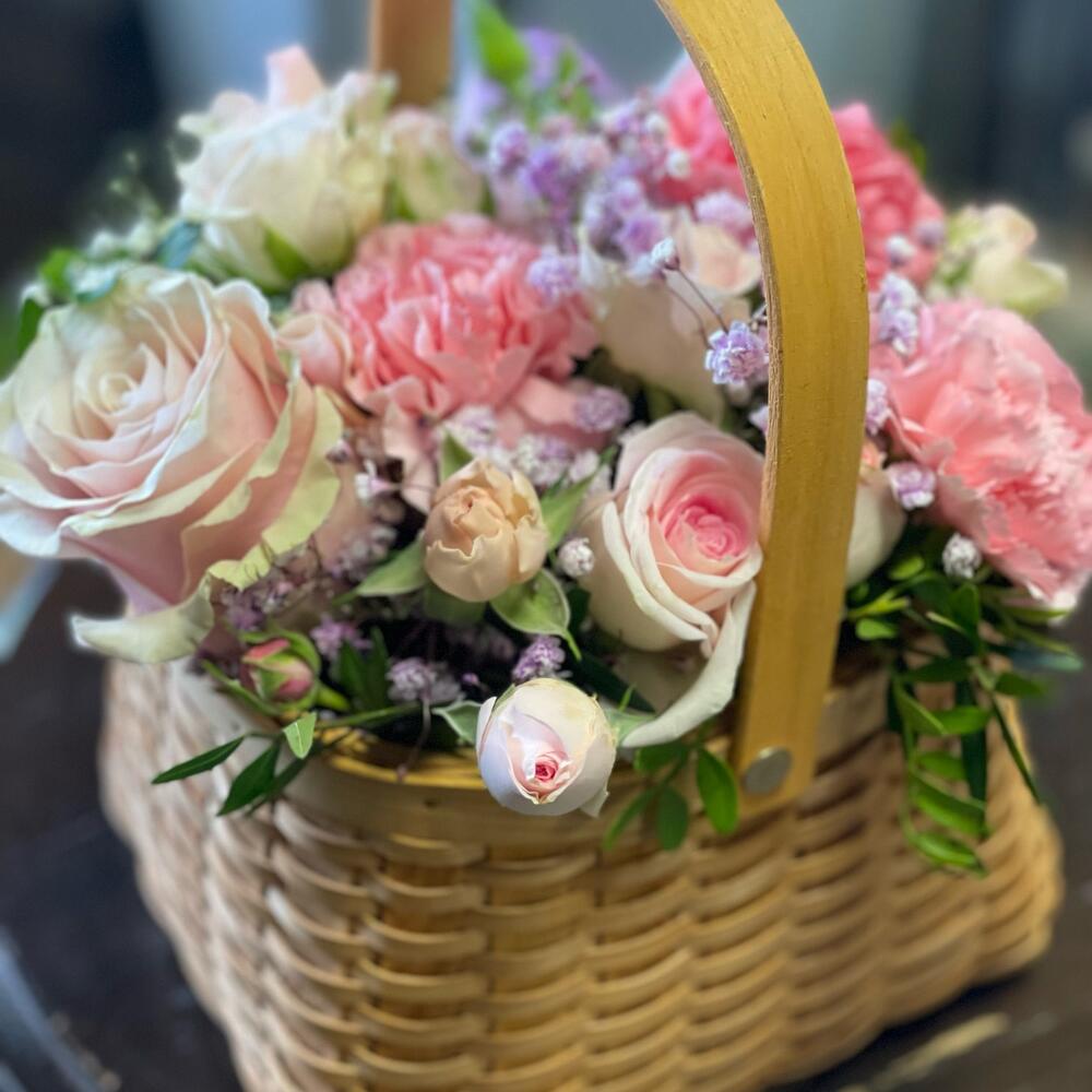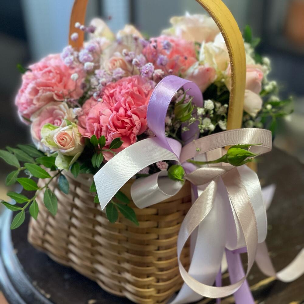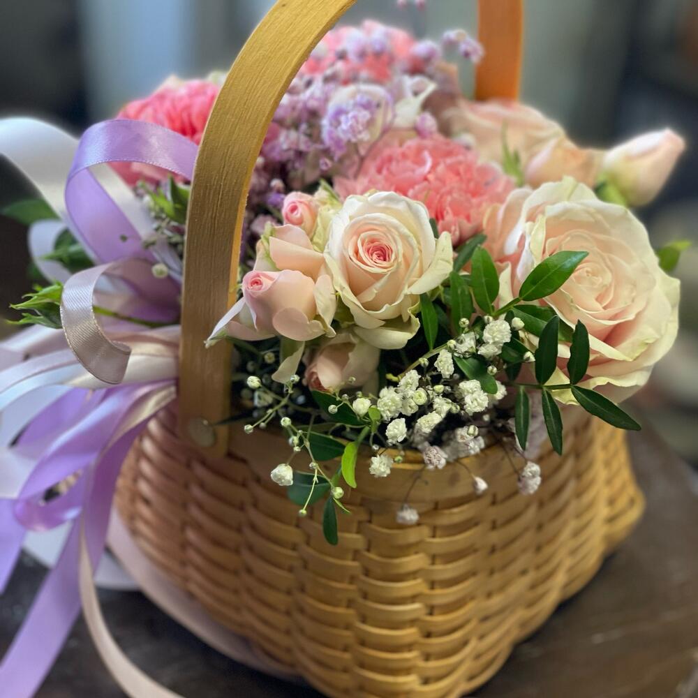 Роза – 1 шт. Диантус – 3 шт. Роза кустовая – 2 шт. Гипсофила – 1 шт. зелень декоративная – 1 шт. Корзина плетеная – 1 шт.