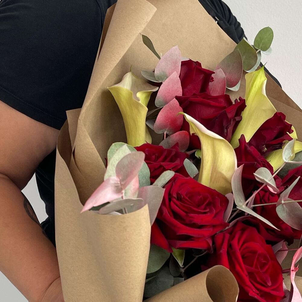 Красные розы и каллы в крафт бумаге