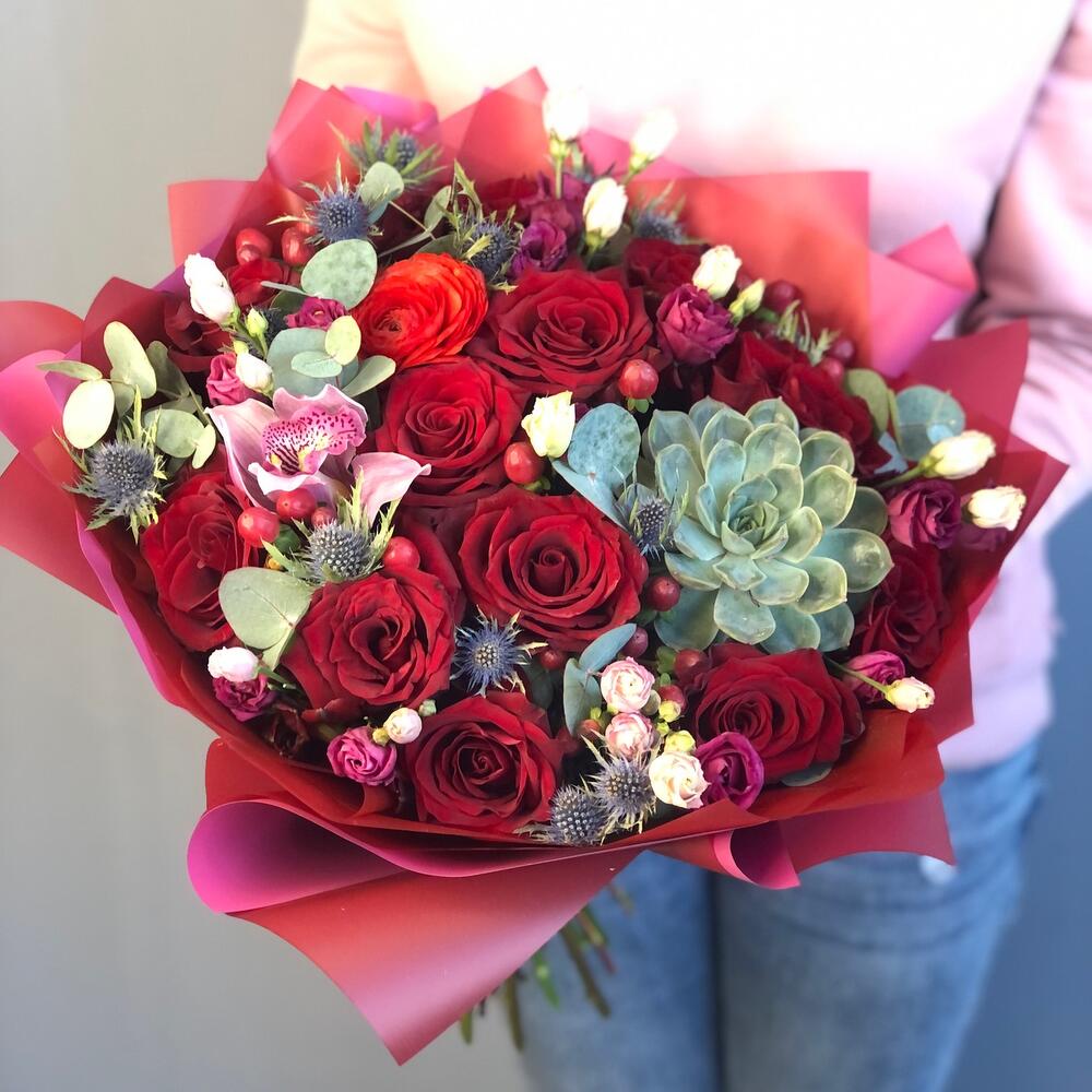 Орхидея Цимбидиум – 1 шт.Эрингиум – 8 шт.Роза – 13 шт.Хиперикум – 5 шт.Суккулент – 1 шт.Упаковка дизайнерская – 2 шт.Лизиантус – 5 шт.Эвкалипт ценерия – 2 шт.Фисташка – 10 шт.
