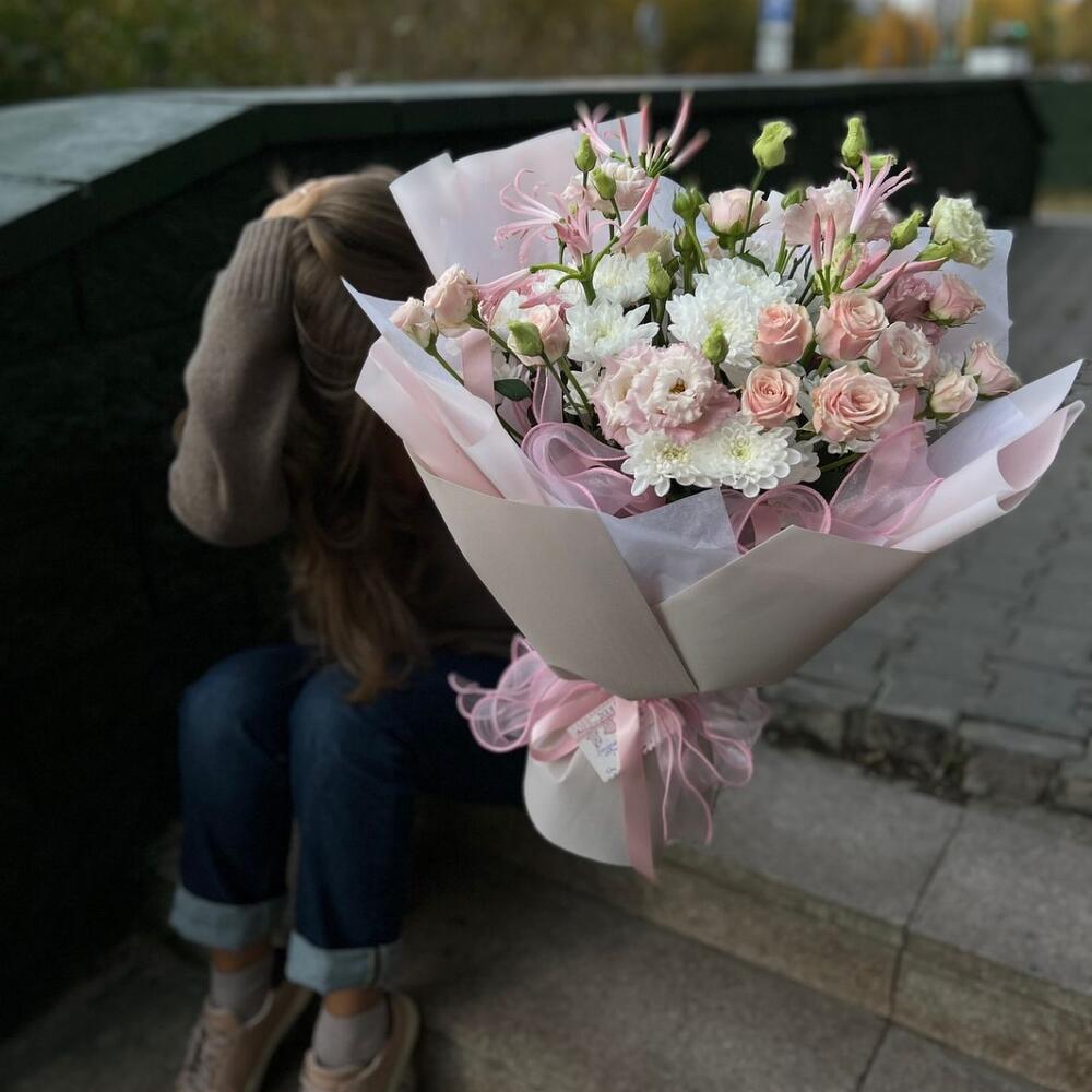 Альстромерии, Кустовые розы, Лизиантусы, Пионовидные розы, Розы, Ромашки