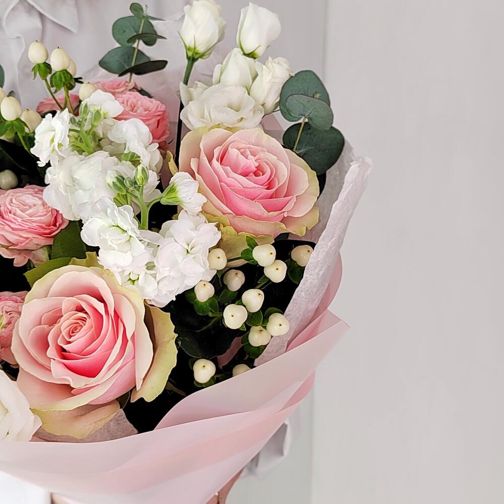 Нежный букет с розой «Бомбастик» и нежно-розовой эустомой