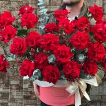 Эвкалипт – 5 шт. Лента атласная – 2 шт. Коробка шляпная – 1 шт. Фисташка – 2 шт. Хамелациум – 5 шт. Роза голландия – 25 шт. Декор – 2 шт. Оазис флористический – 2 шт.