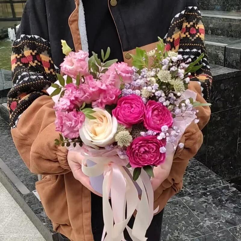 Лизиантус – 1 шт.Роза кустовая – 1 шт.Гипсофила – 1 шт.Астранция – 1 шт.Фисташка – 2 шт.Тишью – 1 шт.коробка 12*12 – 1 шт.