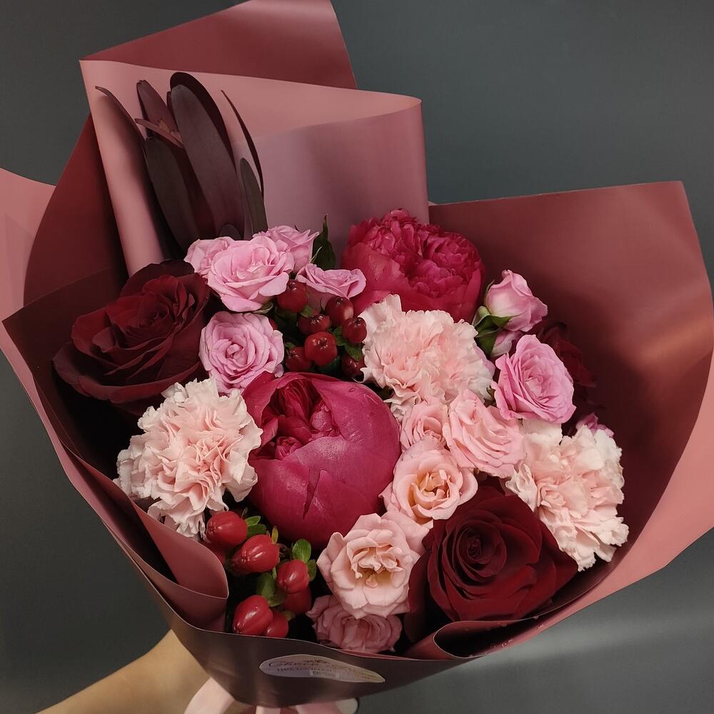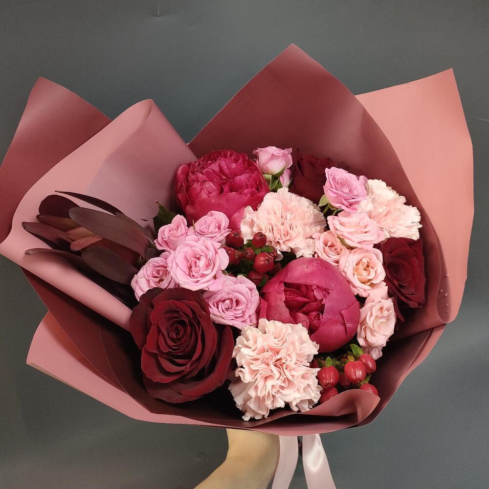 Гвоздики, Кустовые розы, Лизиантусы, Пионовидные розы, Розы