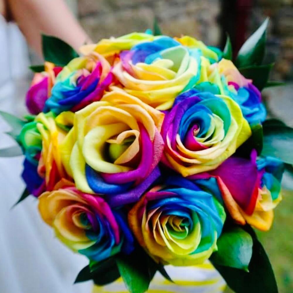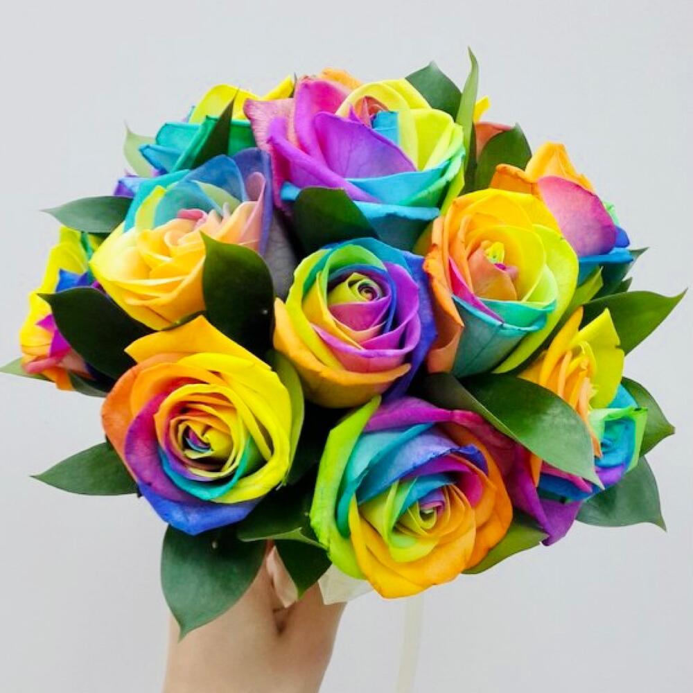 Зелень – 3 шт.Лента атласная – 1 шт.Роза радужная эквадор – 19 шт.бутоньерка для жениха – 1 шт.