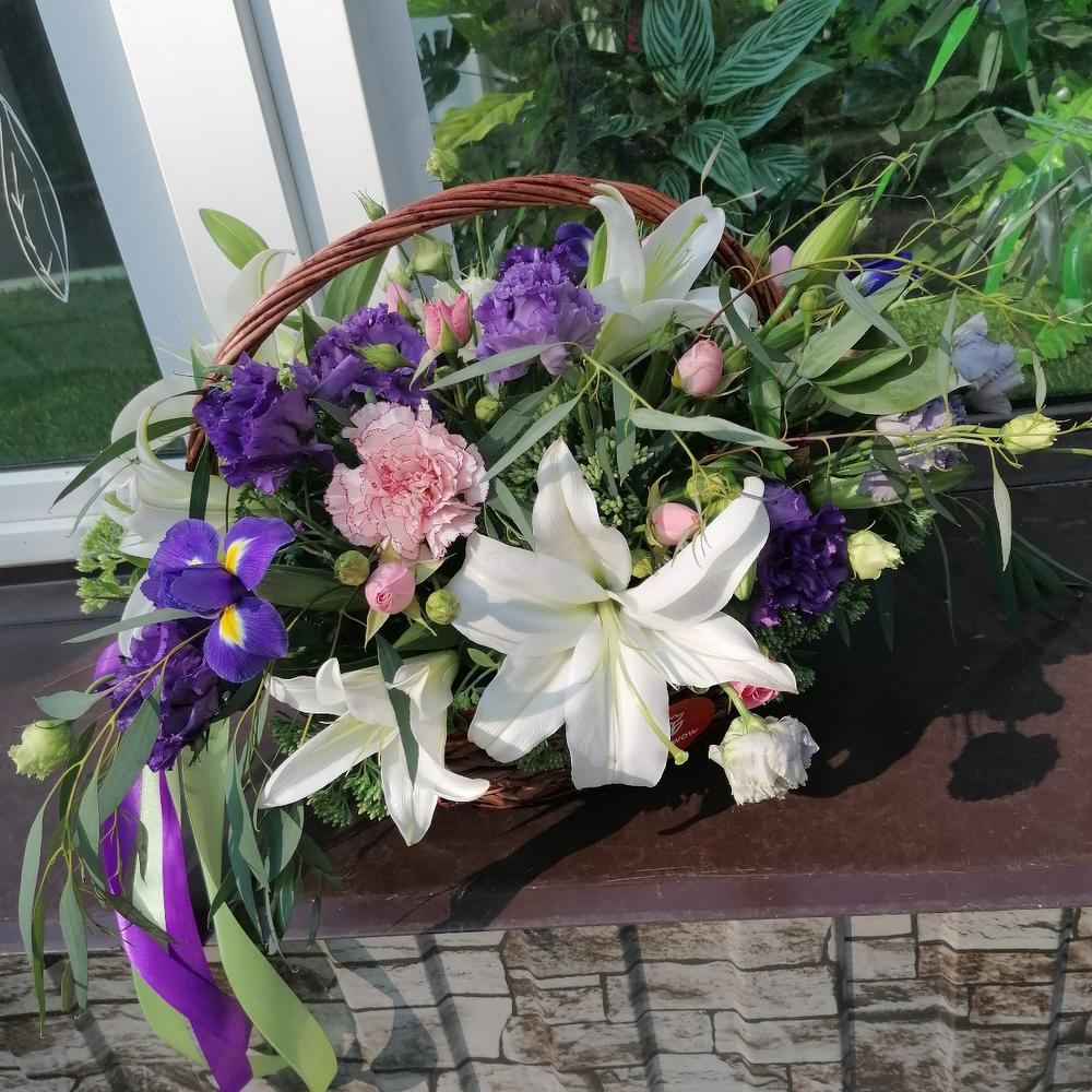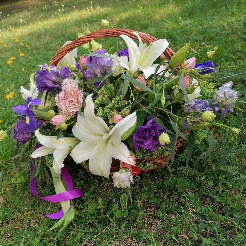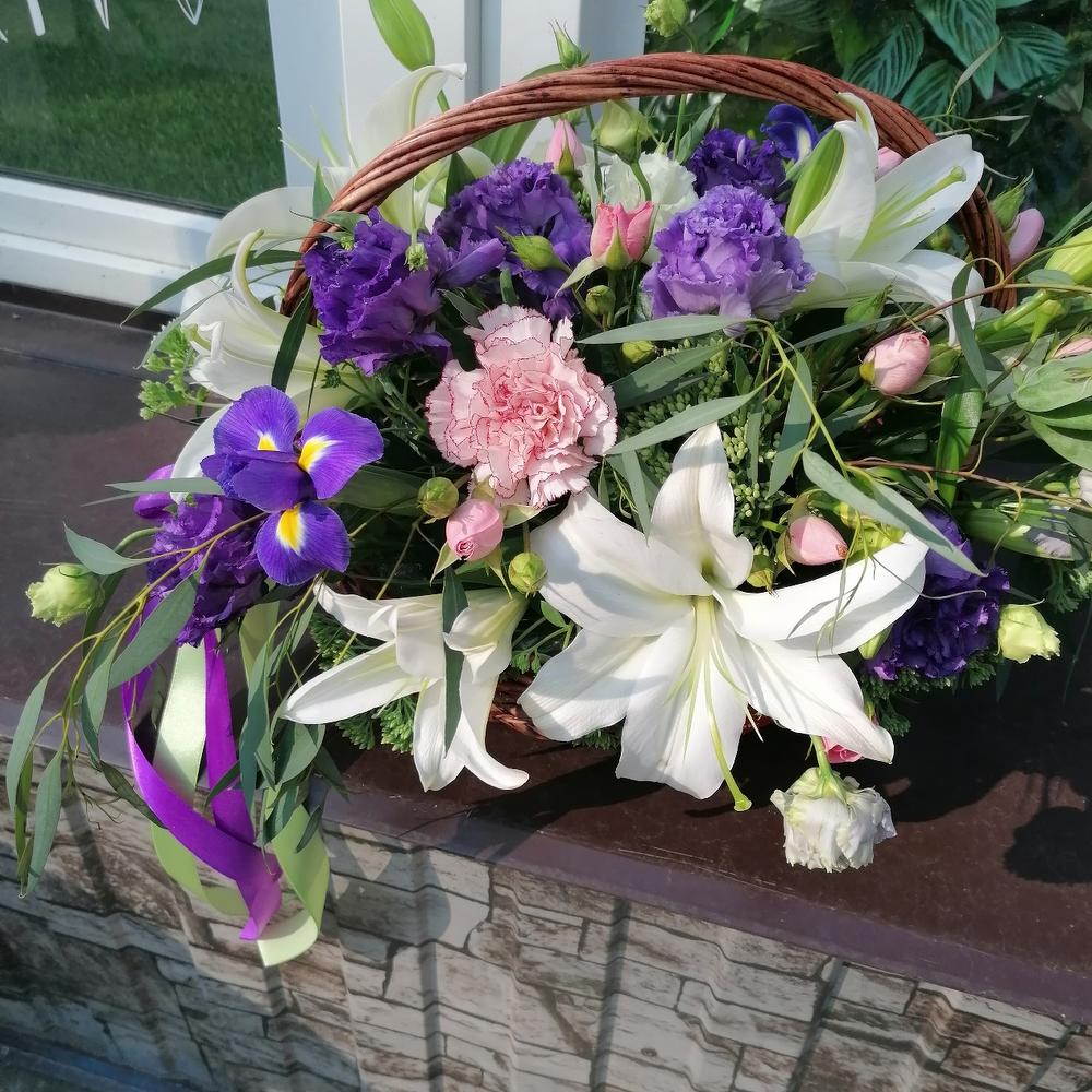 Корзина – 1 шт.Оазис флористический – 1 шт.Эустома – 3 шт.Гвоздика – 2 шт.Лилия – 2 шт.Очиток – 5 шт.Эвкалипт – 5 шт.Ирис – 3 шт.Роза кустовая – 2 шт.Лента атласная – 2 шт.