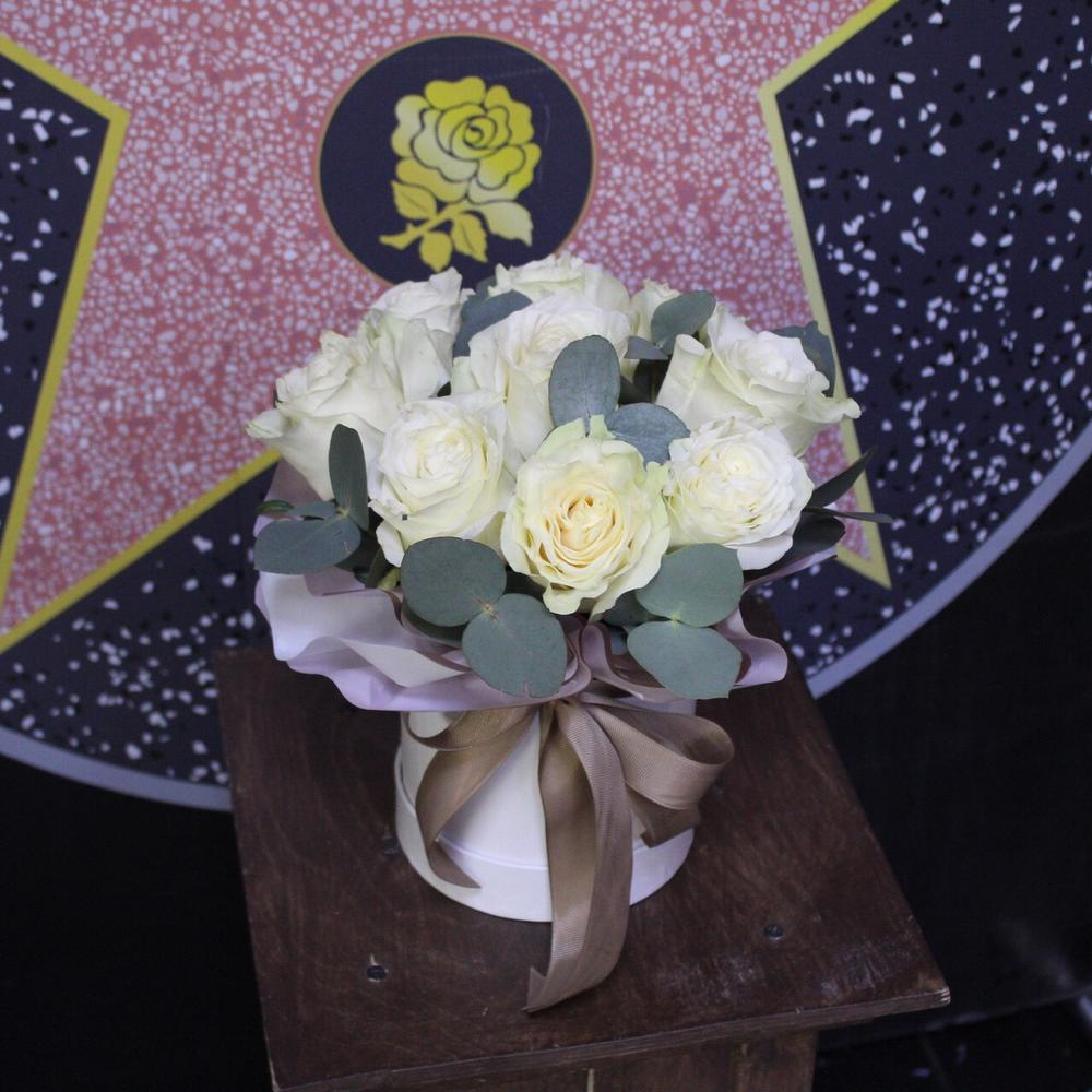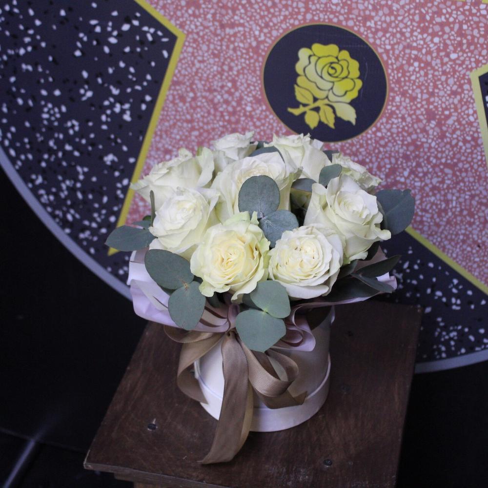Роза Мондиаль – 9 шт.Эвкалипт – 3 шт.Пленка дизайнерская – 1 шт.Оазис флористический – 1 шт.Коробка шляпная – 1 шт.Лента атласная – 1 шт.