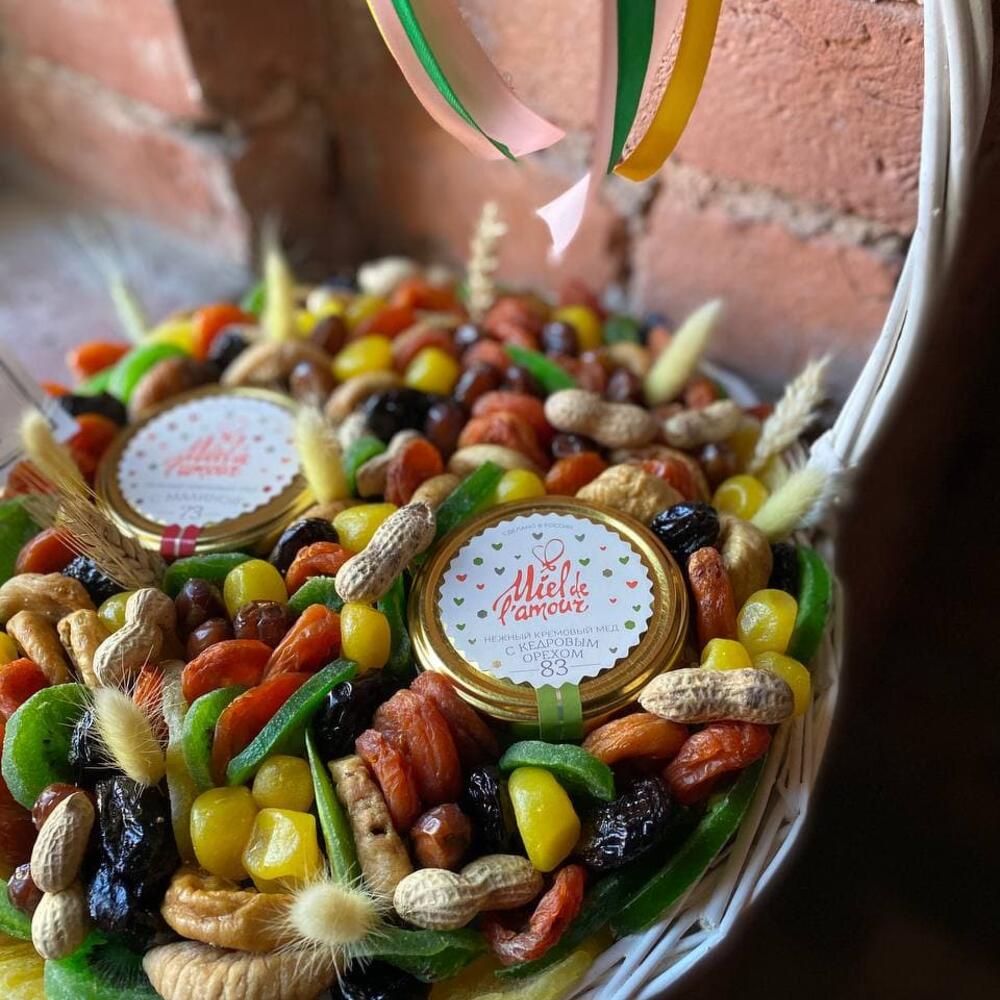 Корзина с орехами, сухофруктами и мёдом “Первые ростки”